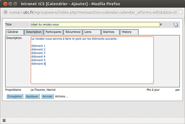 Dans l'onglet participants : Inviter les participants en sélectionnant dans la liste un participant et cliquant ensuite sur ajouter. Répéter pour chaque participant. Un courriel d'invitation sera envoyé systématiquement. Chaque participant sera invité alors à confirmer ou décliner la proposition de rendez-vous et les différents invités également notifiés par mail.